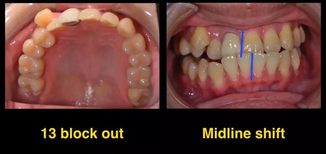 我们从上颌的合面和口内正面观可以看到,因为13唇侧错位,所以中线是偏斜的。上颌牙弓比较宽,