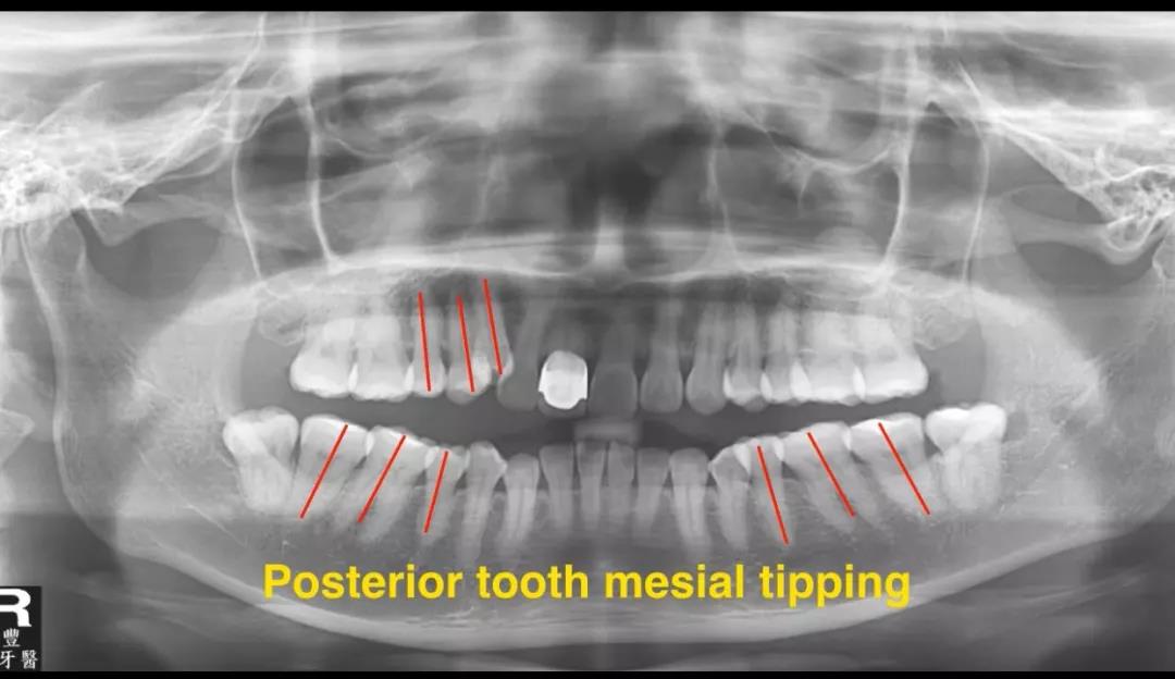 从全景片上分析,上下颌后牙都有近中倾斜的情况,下颌智齿存在。