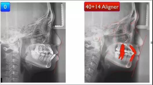 从侧面对比来看,一开始患者后牙区开颌明显,在40副时开颌还没有完全纠正,通过40副之后追加的牙套把后牙的咬合调整完成。